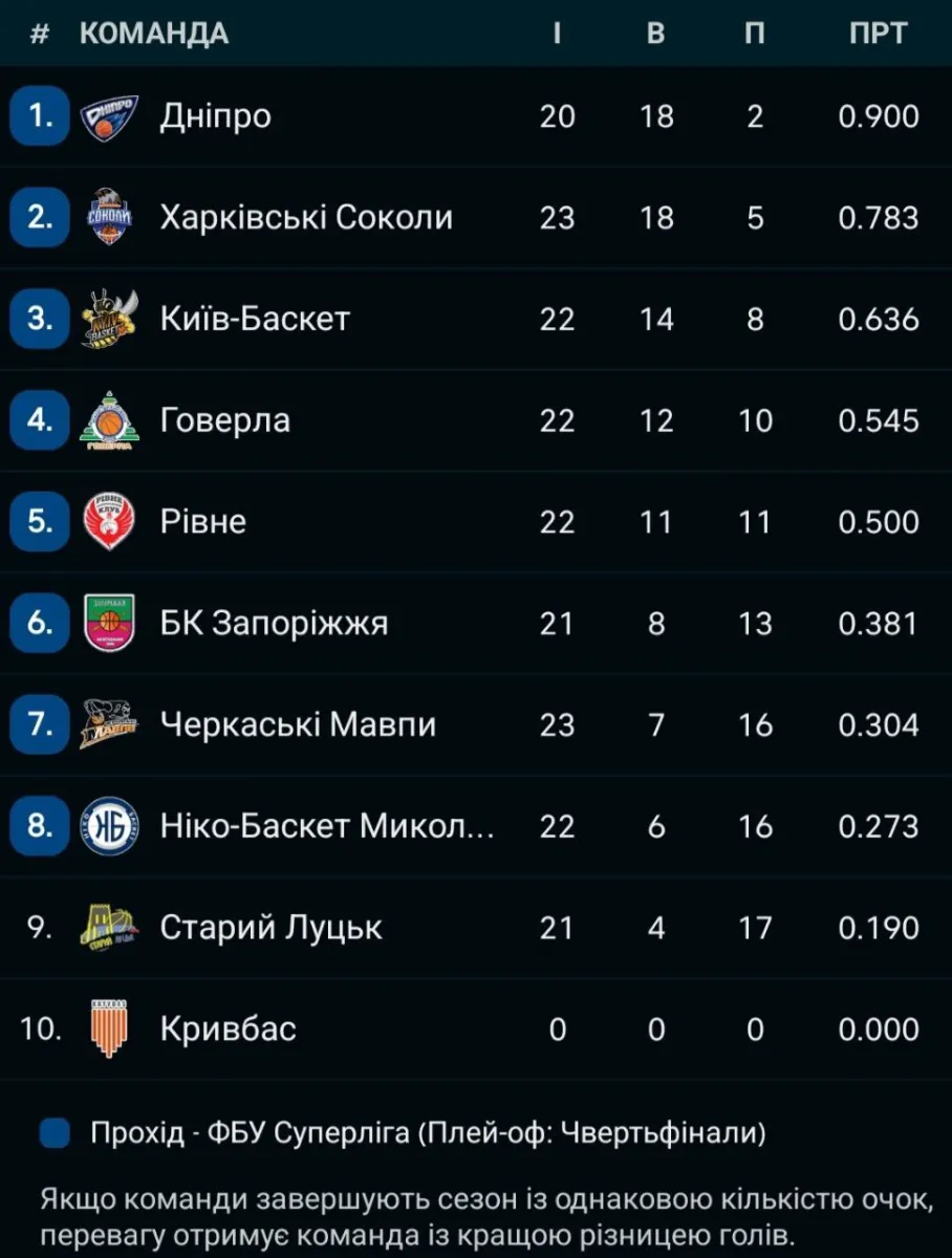 У турнірній таблиці чемпіонату України лідером залишається БК Дніпро, на другому місці йдуть Харківські Соколи, а топ-3 замикає Київ-Баскет.