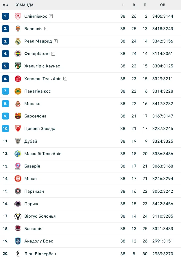 За підсумками регулярного чемпіонату Євроліги сформувався повний склад плейоф та плейін. Боротьбу за трофей продовжить і мадридський Реал, за який виступає український центровий Олексій Лень.
