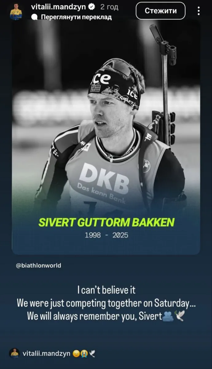 У вівторок, 23 грудня, стало відомо про смерть норвезького біатлоніста Сіверта Гутторма Баккена у віці 27 років. На трагічну подію відреагував Віталій Мандзин.