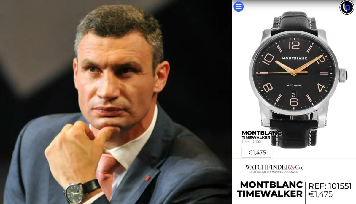 Зірка боксу і мер Києва Віталій Кличко носить годинник бренду Monblanc, а саме варіацію TimeWalker 101551. Про це повідомляє акаунт «Cats and Watches» в Threads.