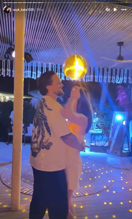 Також обраниця чемпіона надважкої ваги показала їхнє спільне фото ввечері на пляжі, де вони танцюють на святковій вечірці на честь особливого дня для Усика.