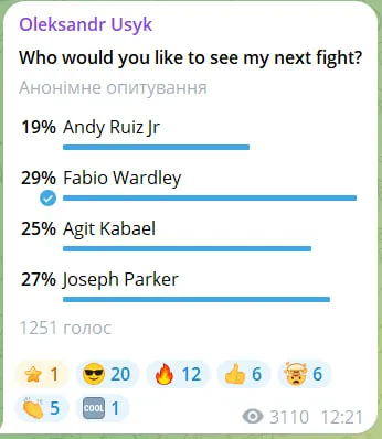 Олександр Усик (24-0, 15 КО) у своєму телеграмі-каналі влаштував опитування щодо того, кого вболівальники хотіли б побачити його наступним суперником.
