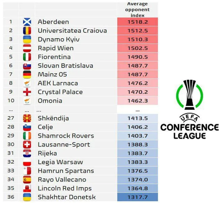 Платформа футбольна статистика Football Meets Data оцінила рівень суперників для київського Динамо та донецького Шахтаря у Лізі конференцій.