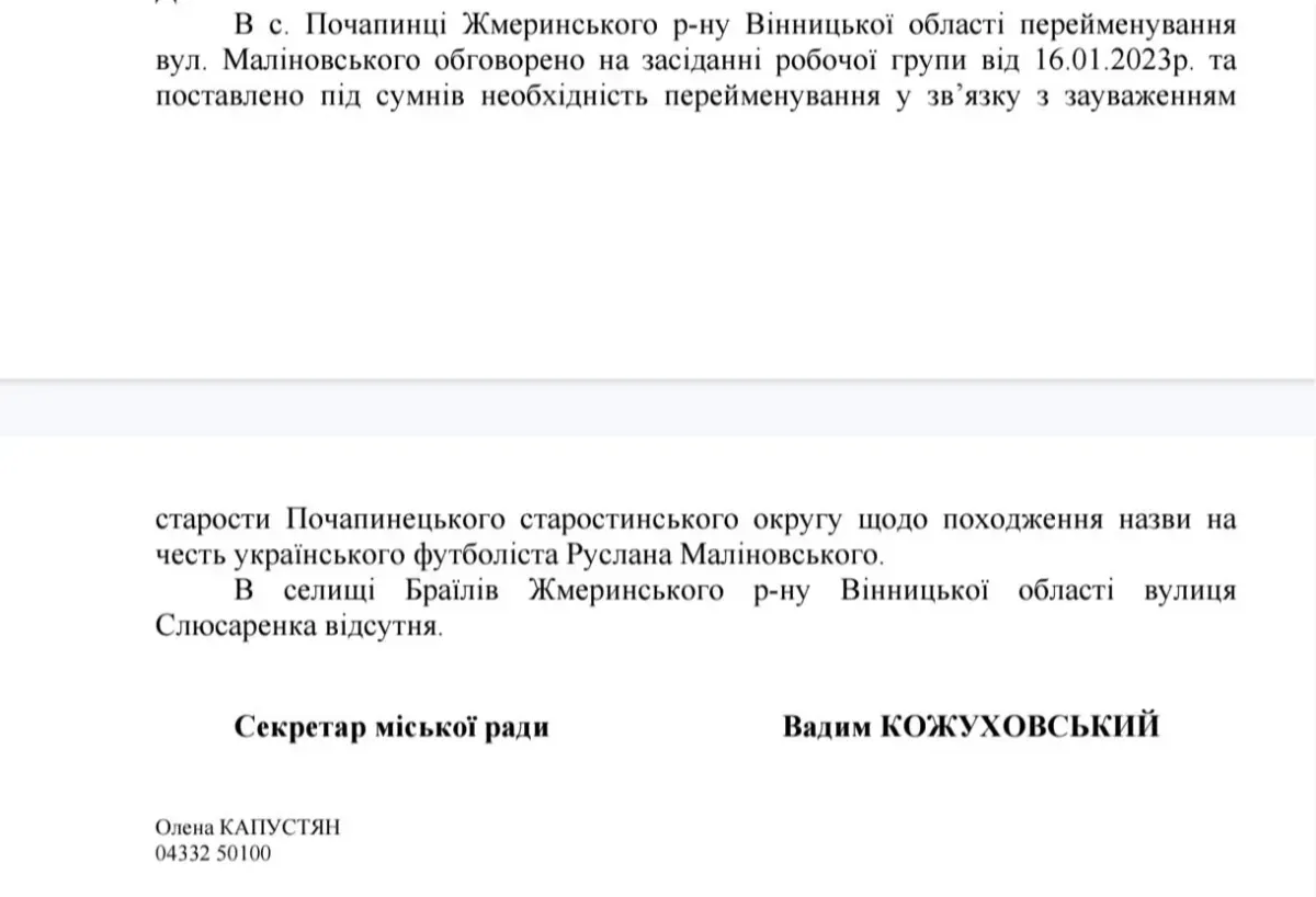 У Жмеринському районі Вінницької області вирішили не перейменовувати вулицю Малиновського, оскільки її названо на честь півзахисника збірної України.