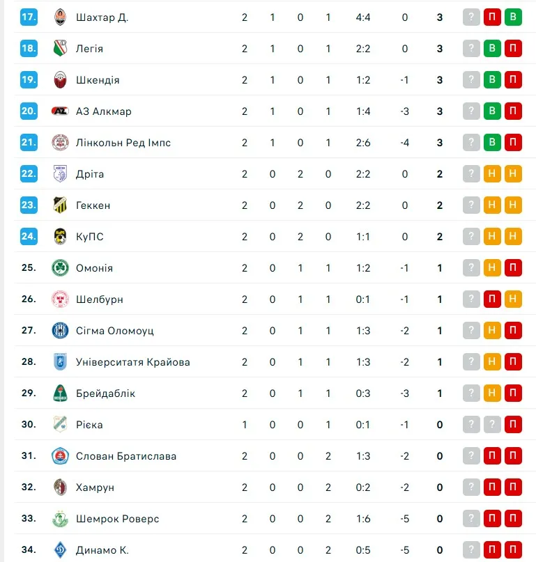 Після двох турів основного етапу Ліги конференцій Динамо посідає 34 місце серед 36 команд (0 очок). Шахтар йде на 17-й позиції (3 бали).