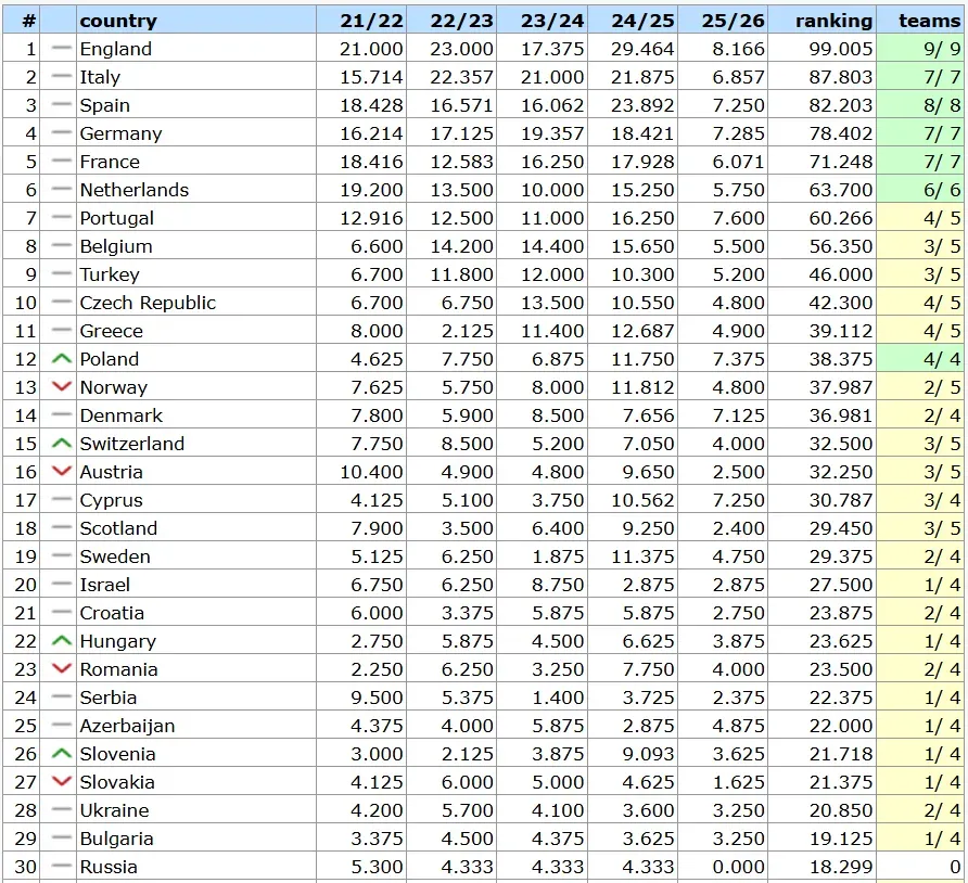 Якщо ситуація не зміниться, і підсумкове місце України в рейтингу залишиться між 28-м і 30-м, то з сезону 2027/28 чемпіон країни стартуватиме у Лізі чемпіонів не з другого, а з першого кваліфікаційного раунду.