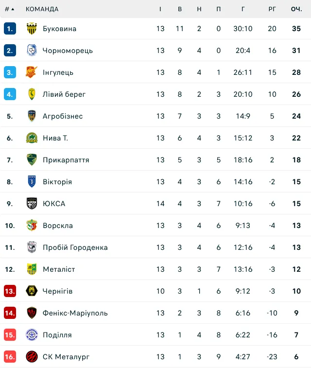 ЮКСА перемогла Металіст, а Лівий Берег розгромив Металург: турнірна таблиця Першої ліги після зіграних матчів