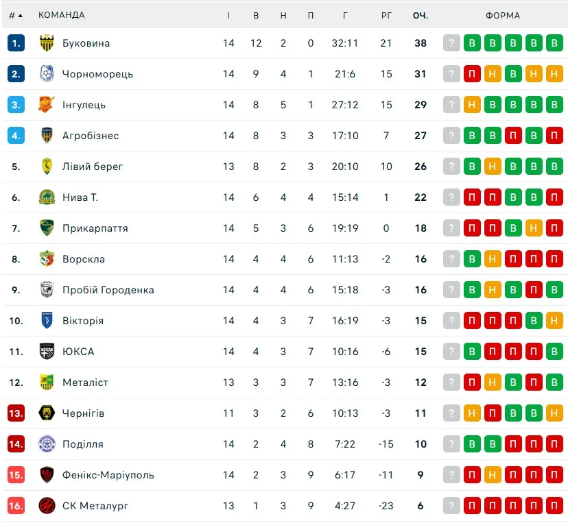 Чвертьфіналіст Кубку України не може виграти вісім турів поспіль: турнірна таблиця Першої ліги після 14-го туру