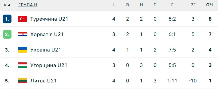- У рамках групи Н Україна займає третє місце, поступаючись лідируючим туркам одним очком, а також Хорватії за додатковими показниками.