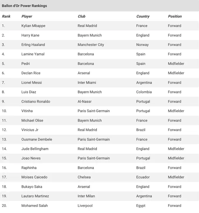 Також відзначимо присутність у топ-10 Кріштіану Роналду та Ліонеля Мессі, які грають за Аль-Наср та Інтер Маямі відповідно.