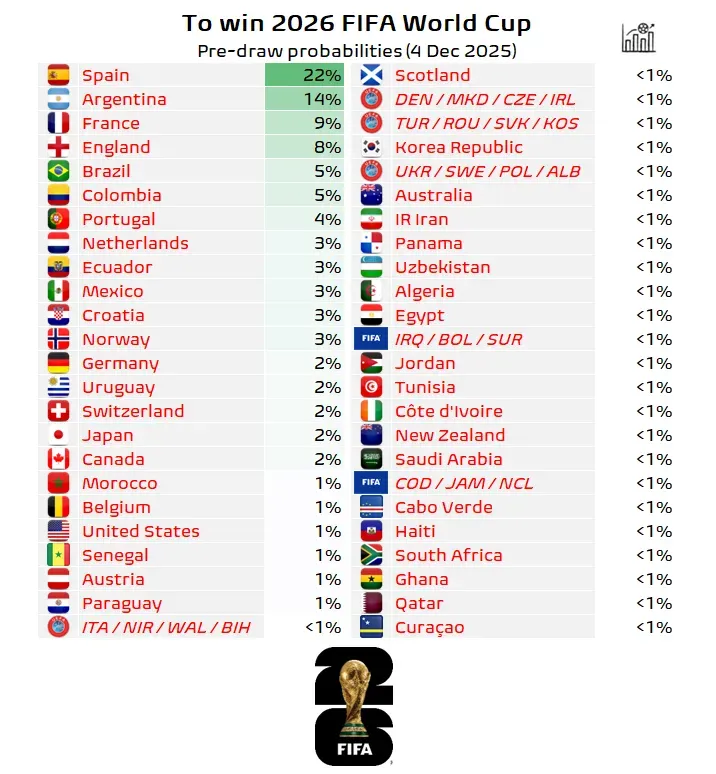 Тим часом для України ситуація поки невизначена: національна команда ще не гарантувала собі участь у фінальній частині змагань. Командам, які проб’ються на турнір через цей шлях кваліфікації, модель прогнозує менше 1% на підсумкову перемогу.