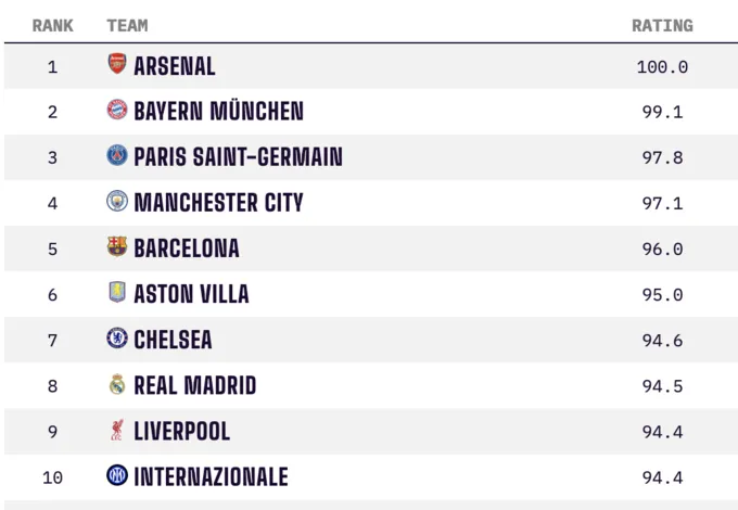 Найсильнішим клубом світу за версією Opta на даний момент є Арсенал, а в топ-5 також входять Баварія, ПСЖ, Манчестер Сіті і Барселона. Серед цікавого – Астон Вілла займає шосте місце і розташувалася вище за такі клуби, як Челсі, Реал, Ліверпуль та Інтер.