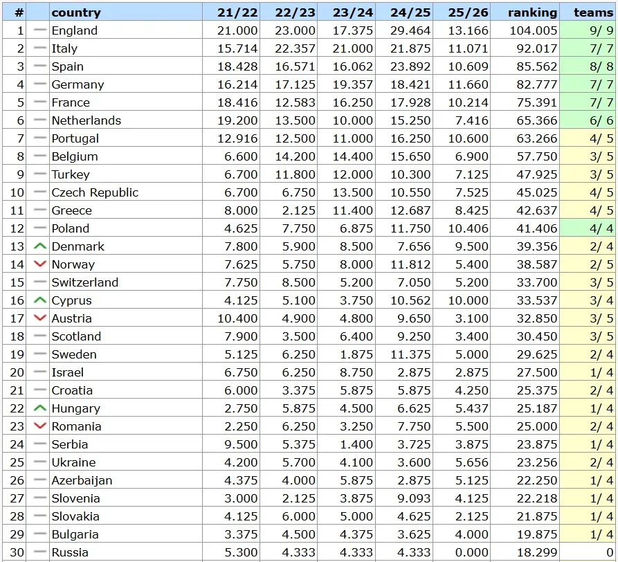 Вчорашні матчі Ліги конференцій завершили черговий єврокубковий тиждень, за підсумками якого оновилася таблиця коефіцієнтів УЄФА.