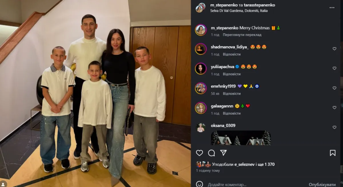 Фото з Тарасом та трьома синами на своїй сторінці в Інстаграмі опублікувала дружина Степаненка – Маргарита. Судячи з підпису, перебували вони у Сельва Гардені, одному з найпрестижніших гірськолижних курортів у Доломітових Альпах, розташованому в італійській долині.