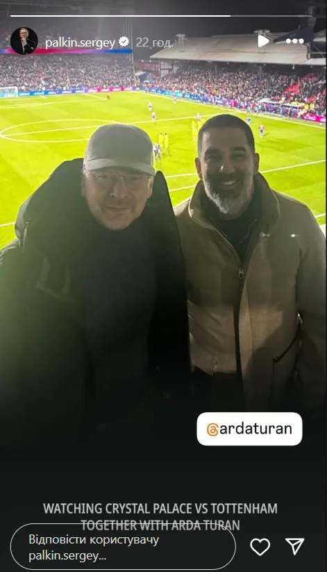«Перегляд матчу Крістал Пелас – Тоттенхем разом з Ардою Тураном», – підписав світлину Палкін.