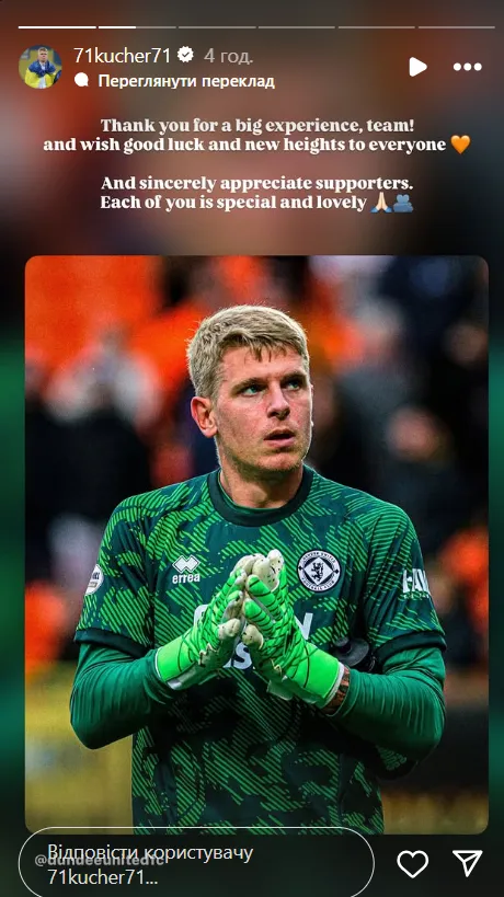 Кучеренко попрощався з Данді Юнайтед після свого продажу у Грецію: що написав український воротар про команду