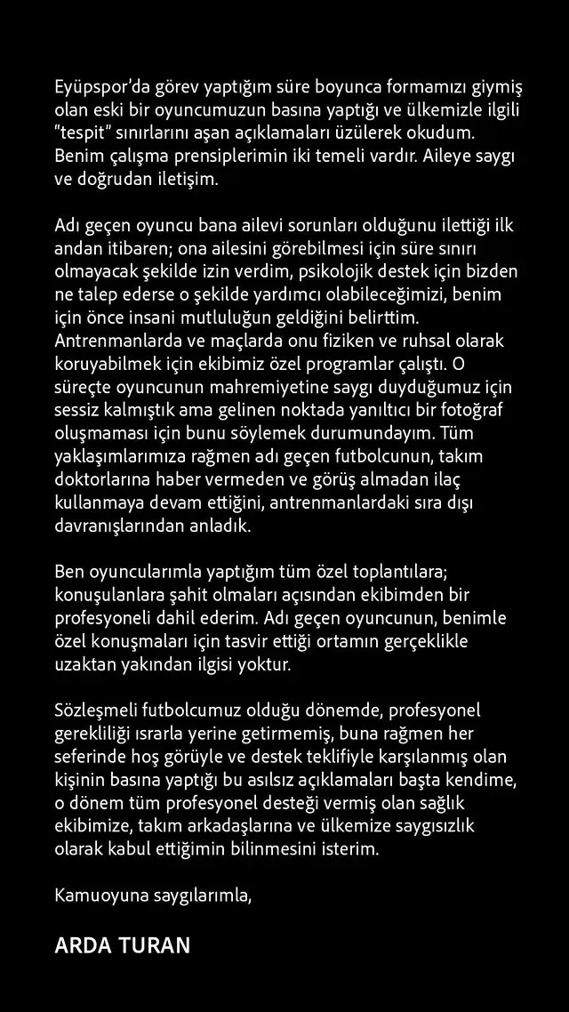 «На всі приватні зустрічі з гравцями я запрошую професіонала зі своєї команди, щоб був свідок нашої розмови. Опис обстановки, який надав згаданий гравець щодо наших приватних розмов, не має нічого спільного з реальністю», – написав Туран в Instagram.