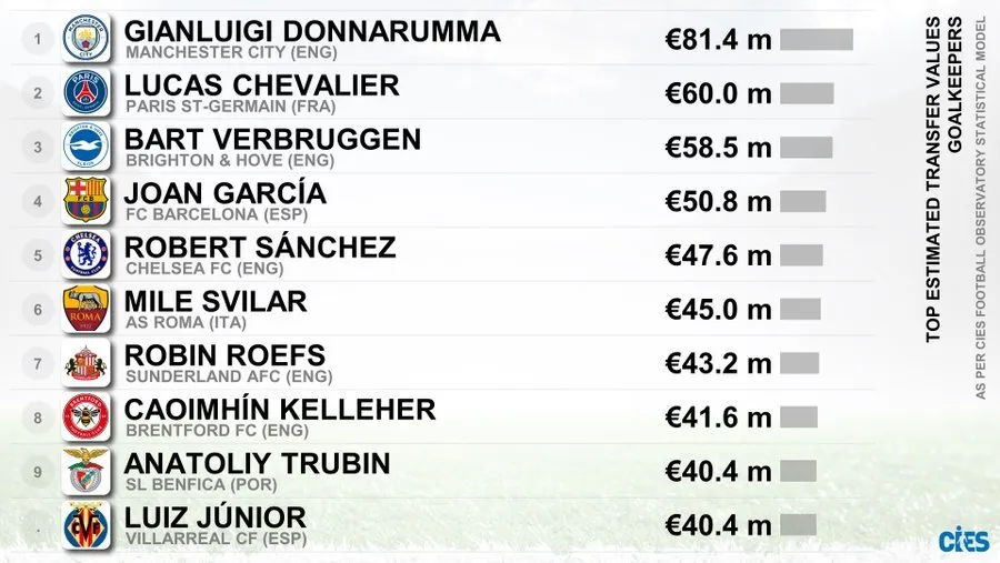 Від лідера списку, воротаря Манчестер Сіті Джанлуїджі Доннарумми, його відділає ще близько 40 мільйонів, адже вартість італійця згідно CIES складає 81,4 млн євро.
