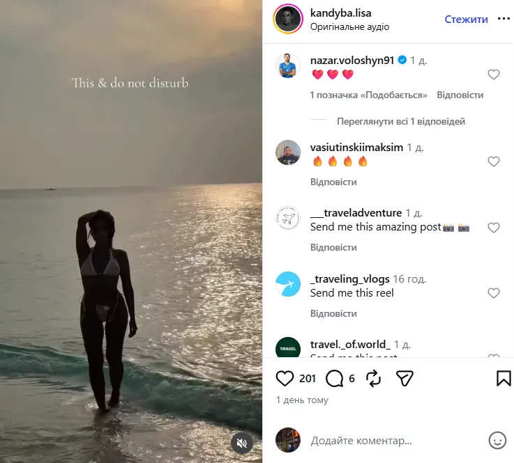 Дівчина вінгера київського Динамо і національної збірної України Назара Волошина, Ліза Кандиба, опублікувала надзвичайно захопливі світлини з пляжу на Мальдівах, вразивши підписників у Instagram відвертістю фотографій.