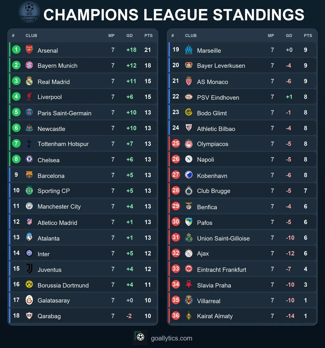 Сьогодні, 21 січня, відбулися заключні матчі сьомого туру основного етапу Ліги чемпіонів. За тур до його завершення відомі 15 з 24 учасників плей-оф. При цьому тільки лондонський Арсенал і мюнхенська Баварія отримали прямі путівки відразу до 1/8 фіналу.