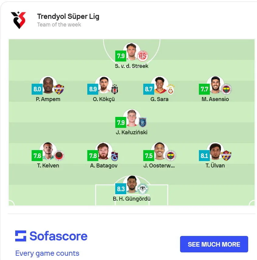 Символічна збірна 20-го туру чемпіонату Туреччини від SofaScore. Фото: SofaScore