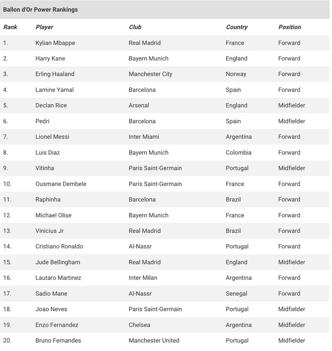 До десятки претендентів також увійшли Ламінь Ямаль, Деклан Райс, Педрі, Ліонель Мессі, Луїс Діас, Вітінья та Усман Дембеле.
