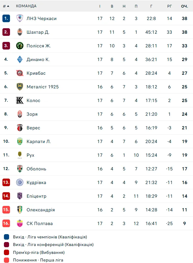 Турнірна таблиця УПЛ після 17-го туру