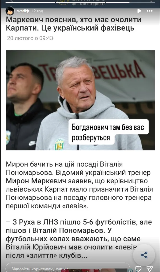 Заява відомого тренера Мирона Маркевича про тренера Карпат викликали публічну реакцію Святослава Козловського у соцмережах.