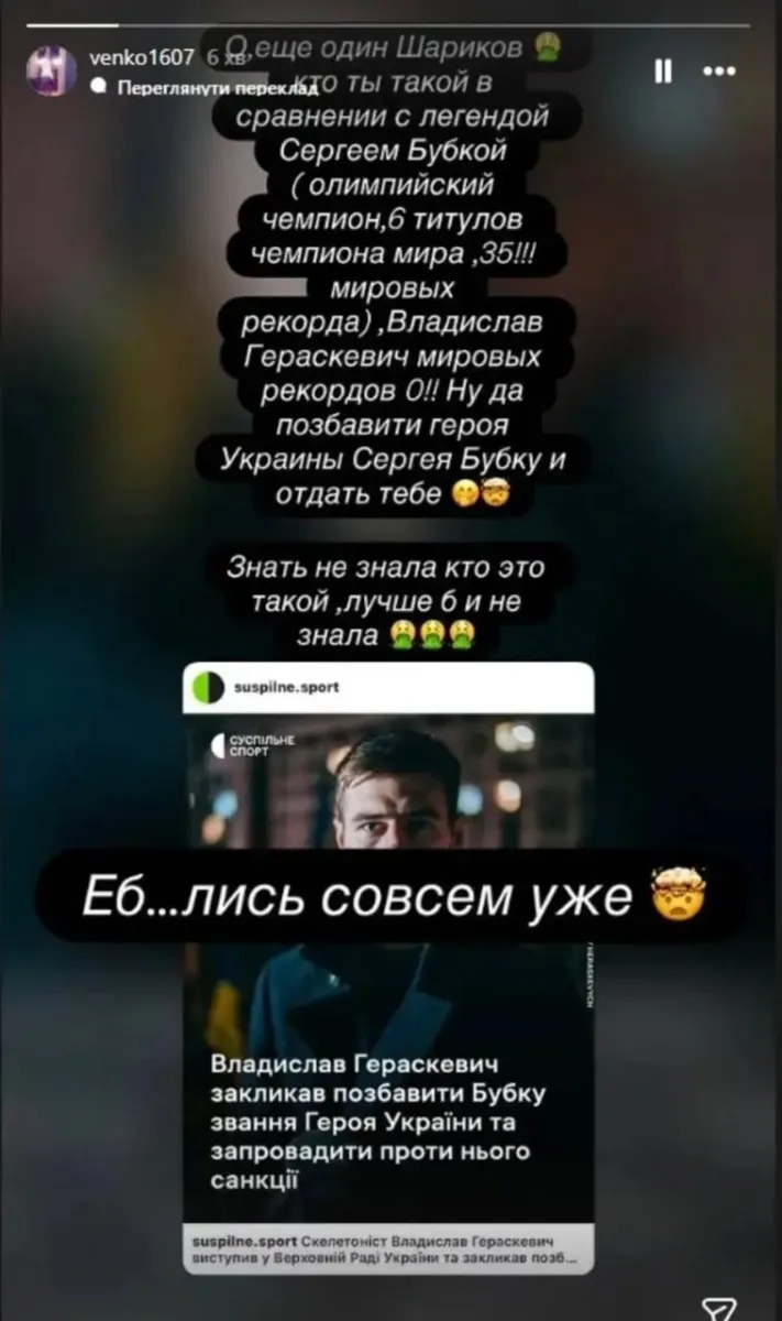 «О, ще один Шариков. Хто ти такий у порівнянні з легендою Сергієм Бубкою (олімпійський чемпіон, шість титулів чемпіона світу, 35 світових рекордів)? Владислав Гераскевич – світових рекордів нуль. Ну так, позбавити звання Героя України Сергія Бубку і віддати тобі. Знати не знала, хто це такий, краще б і не знала. Й**нулись зовсім вже».