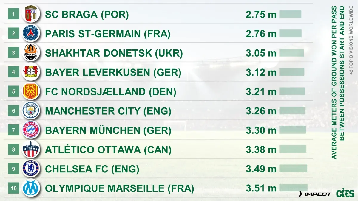 Зазначається, що дослідження охопило 42 ліги світу. Згідно зі звітом, середня відстань просування м'яча Шахтаря за одну передачу становить 3,05 метра.