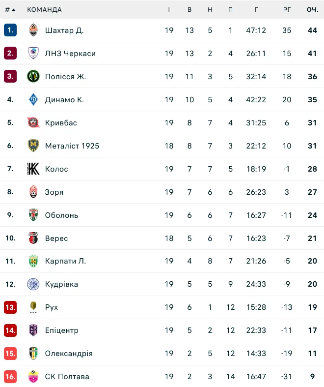 Шахтар очолює чемпіонат України з 44 очками, випереджаючи ЛНЗ на три бали. Динамо приблизилося до топ-3 завдяки виїзній перемозі над Поліссям.