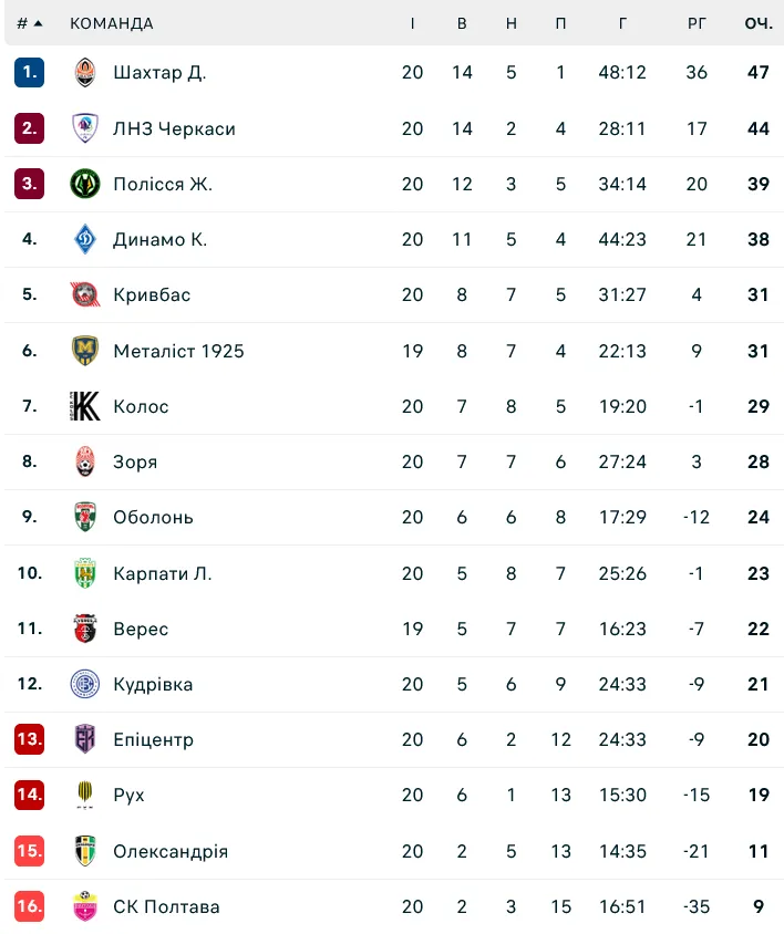 Турнірна таблиця УПЛ за підсумками 20-го туру: Шахтар і ЛНЗ продовжують вести боротьбу за чемпіонство