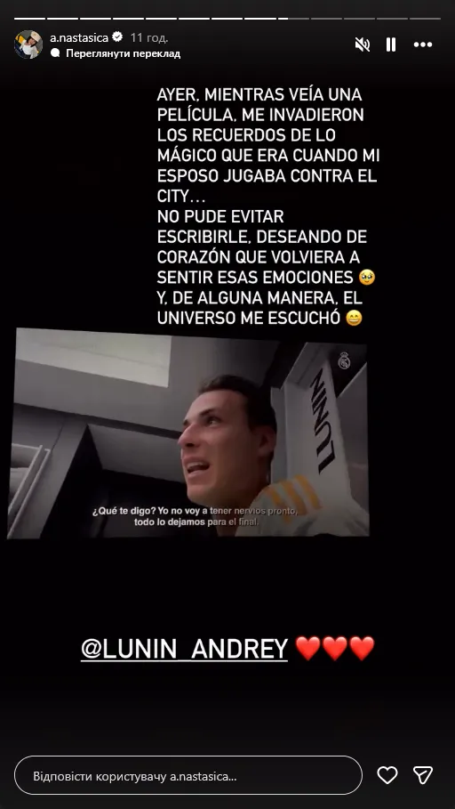У своїй історії в Instagram Анастасія розмістила фрагмент документального відео клубного каналу, де фігурує Лунін, а також додала власний коментар щодо подій останнього матчу.