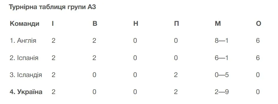 Після поразок у двох стартових турах від Англії та Іспанії збірна України посідає останнє місце у своїй групі.