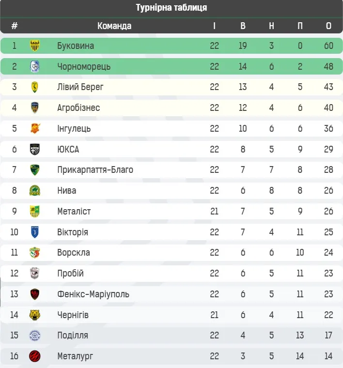 За підсумками 22-го туру чемпіонату України в Першій лізі чернівецька Буковина зуміла до 17 очок збільшити відрив від третього місця, зробивши ще один крок до повернення в УПЛ.