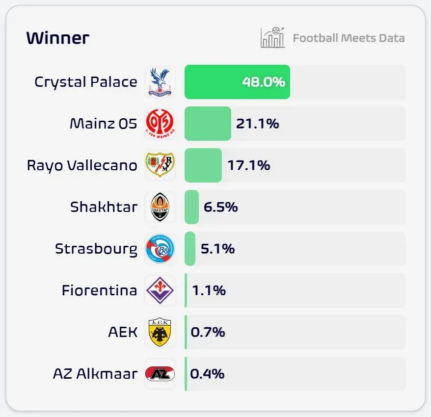 Лідером рейтингу є англійський Крістал Пелас із показником 48%, другим іде німецький Майнц (21,1%), а трійку замикає іспанський Райо Вальєкано з 17,1% шансів на перемогу.