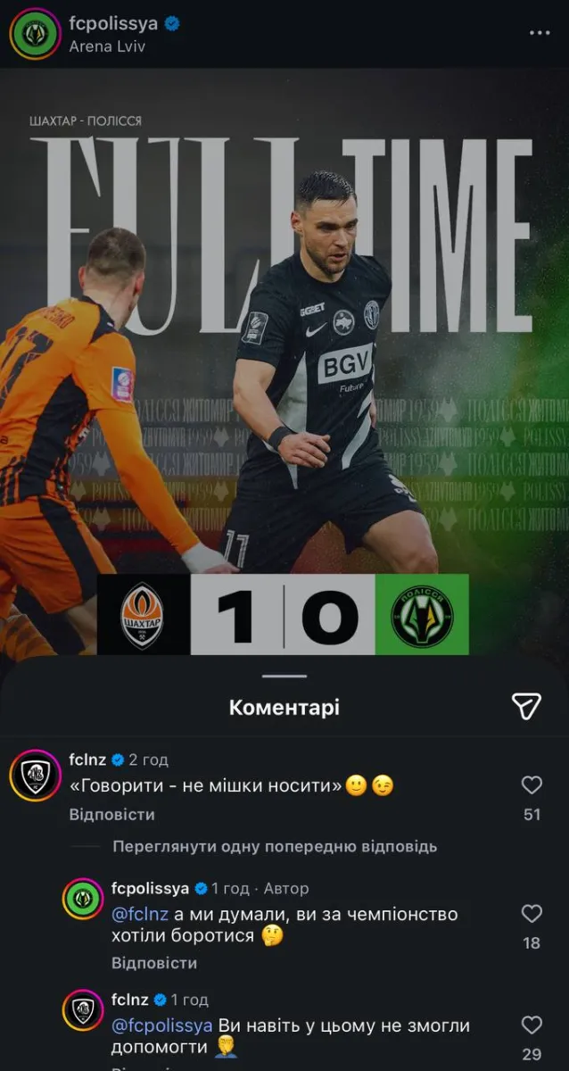 Після гри між клубами розгорнулася перепалка в соцмережах під публікацією Полісся з фінальним результатом. Першим відреагував ЛНЗ, залишивши іронічний коментар: