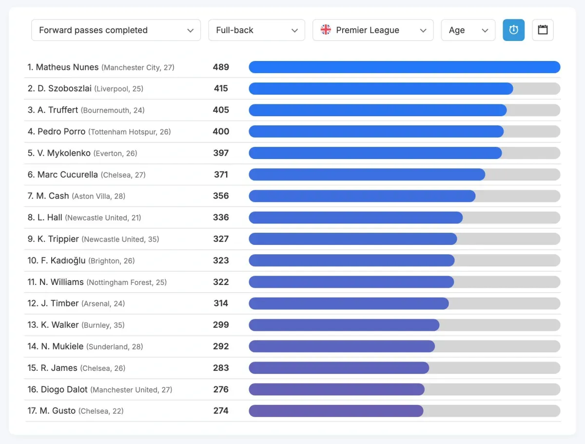 Третє місце зайняв Адрієн Трюффер з Борнмута (405 передач), а четвертим став Педро Порро з Тоттенхема (400). Миколенко замкнув топ-5, випередивши низку інших захисників.