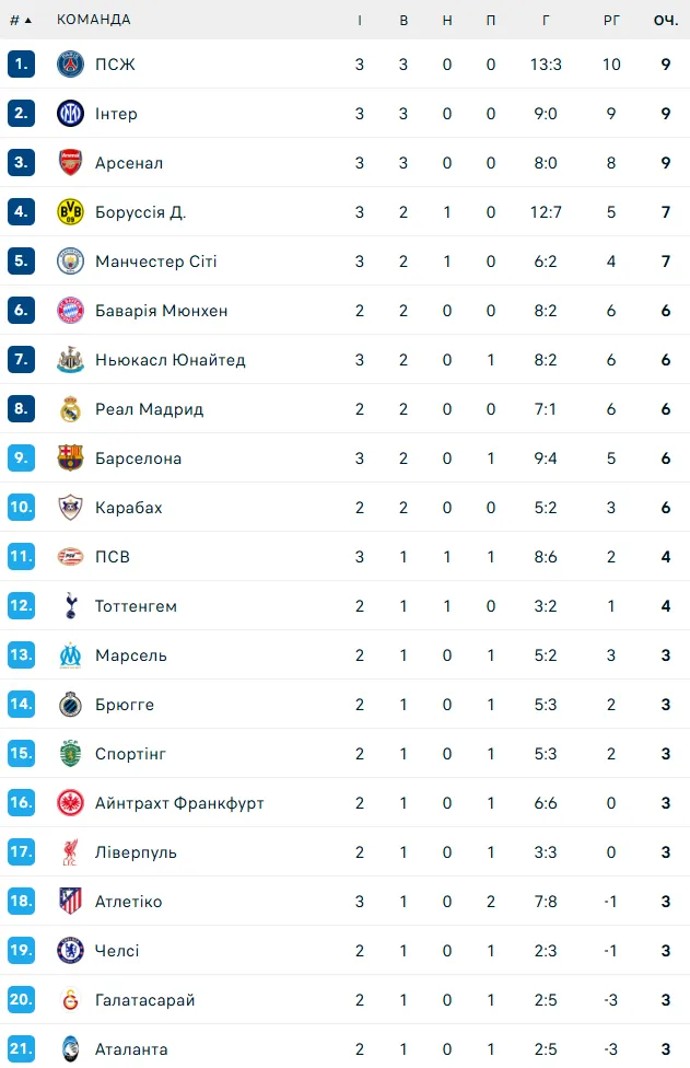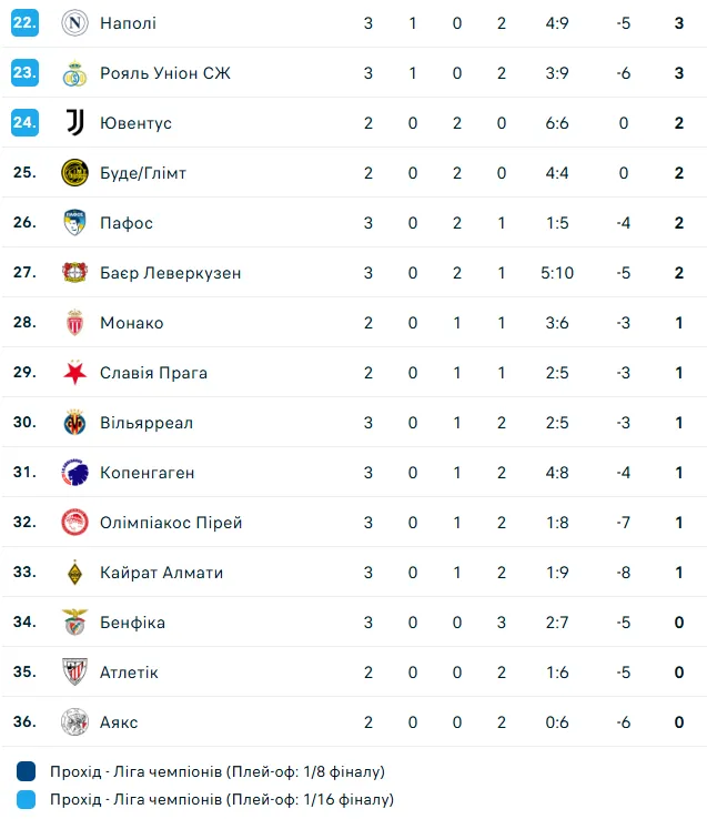 - ПСЖ займає перше місце турнірної таблиці основного етапу Ліги чемпіонів, Олімпіакос – 32-й, а Бенфіка з нулем очків – 34-та.