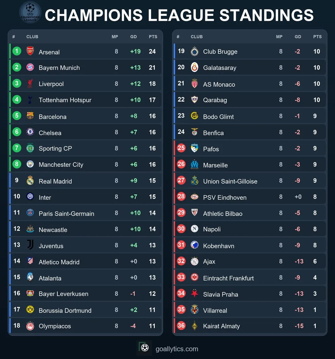 У середу, 28 січня, восьмим туром завершився загальний етап Ліги чемпіонів 2025/26. Відомо учасників 1/8 фіналу і стикових матчів. Які місця посіли команди українців?