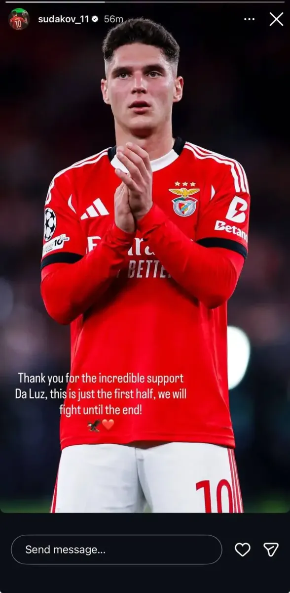 Атакувальний хавбек Бенфіки Георгій Судаков у сторіс на своїй сторінці в Інстаграмі прокоментував поразку з рахунком 0:1 від Реалу у першому стиковому поєдинку Ліги чемпіонів.