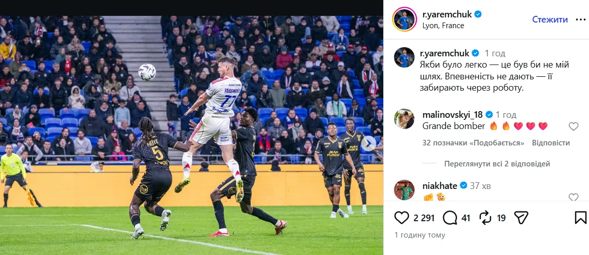 Форвард Ліона Роман Яремчук на своїй особистій сторінці в Інстаграмі прокоментував дебютний гол у Лізі 1 у домашньому матчі 29-го туру проти Лор’яна (2:0).