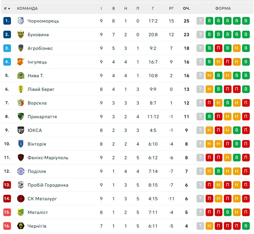 Чорноморець, Буковина та Агробізнес збільшили відрив: турнірна таблиця Першої ліги після сьогоднішніх матчів