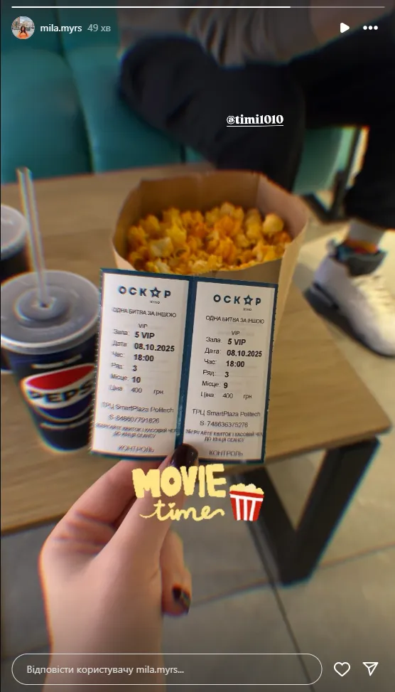 Відповідну світлину із квитками виклала до мережі обраниця екснападника Динамо, а обрали Артем і Таміла новий фільм із легендарним Леонардо Ді Капріо «Одна битва за іншою» (One Battle After Another, 2025).