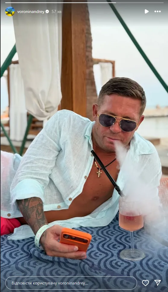 46-річний екснападник лежить у одному з закладів на покривалі і курить кальян, а дивлячись на одяг Вороніна зрозуміло, що на вулиці тримається приємна і тепла погода. Поруч із ним стоїть також напій у келиху.