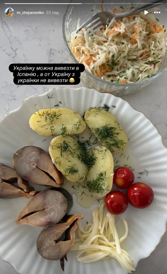 Обраниця футболіста насолодилася картоплею з кропом, скумбрією, маринованими томатами, салатом з капусти, а також соленим сиром.