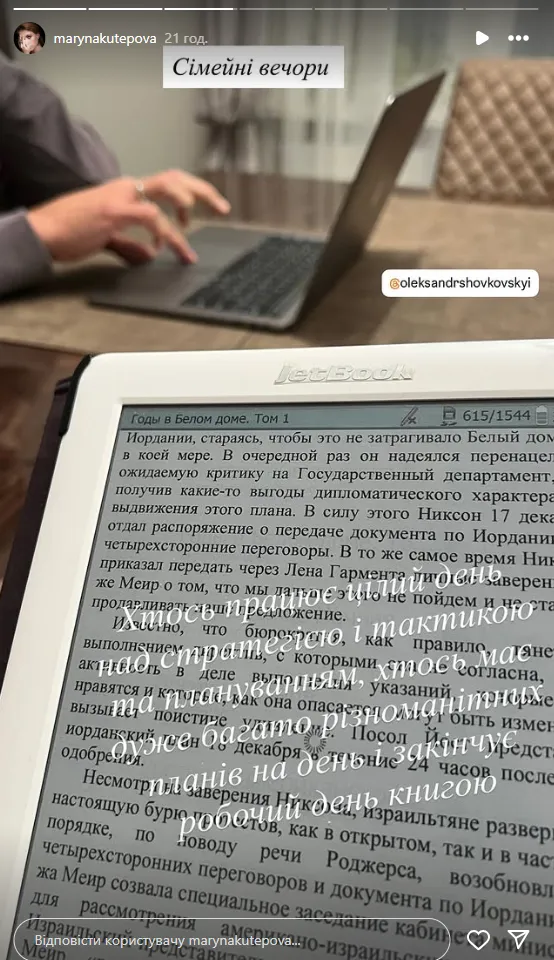 «Сімейні вечори. Хтось працює цілий день над стратегією і тактикою та плануванням, хтось має дуже багато різноманітних планів і закінчує робочий день книгою», – написала в Instagram дружина Шовковського.