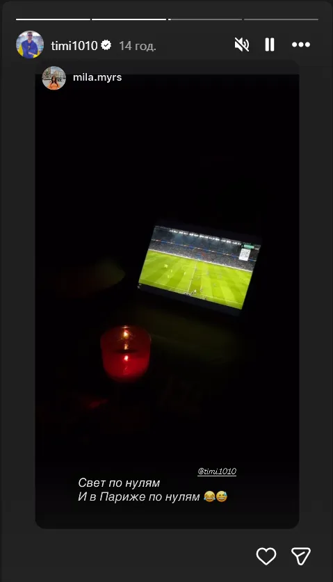 Колишній нападник Динамо і збірної України Артем Мілевський дивився дану гру у компанії своєї дівчини Міли і при відключеному світлі. Кохана ексзірки киян показала, що матч вони переглядали на ноутбуку у темряві. Артем зробив репост її сторіс в Instagram.
