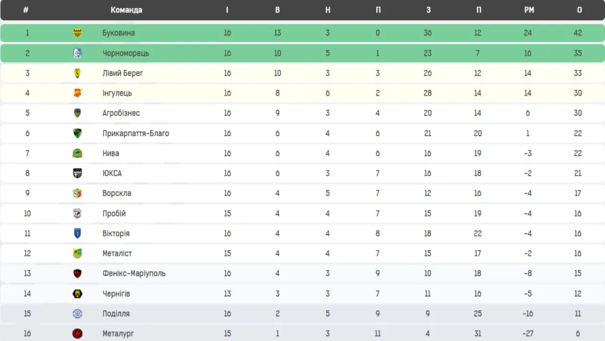Турнірна таблиця Першої ліги після 16-го туру: як виглядає ситуація в чемпіонаті на старті другого кола