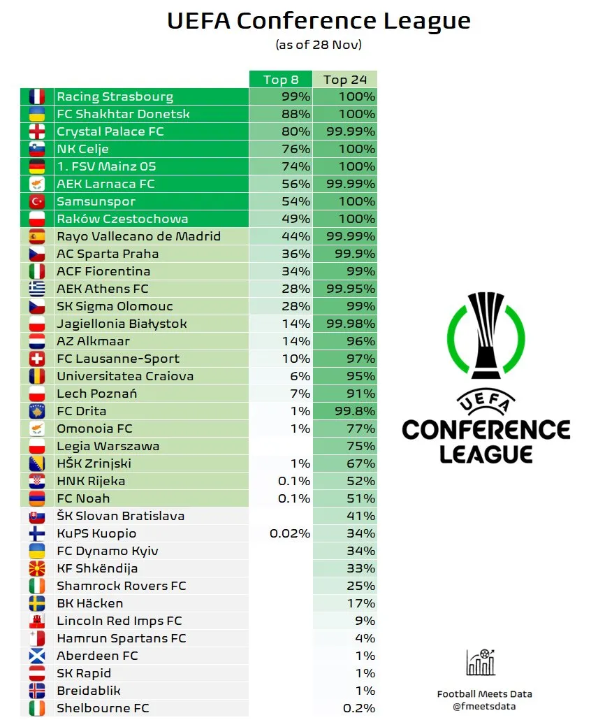 Прогноз від каналу в Х «Football Meets Data» на загальний етап Ліги конференцій після чотирьох турів